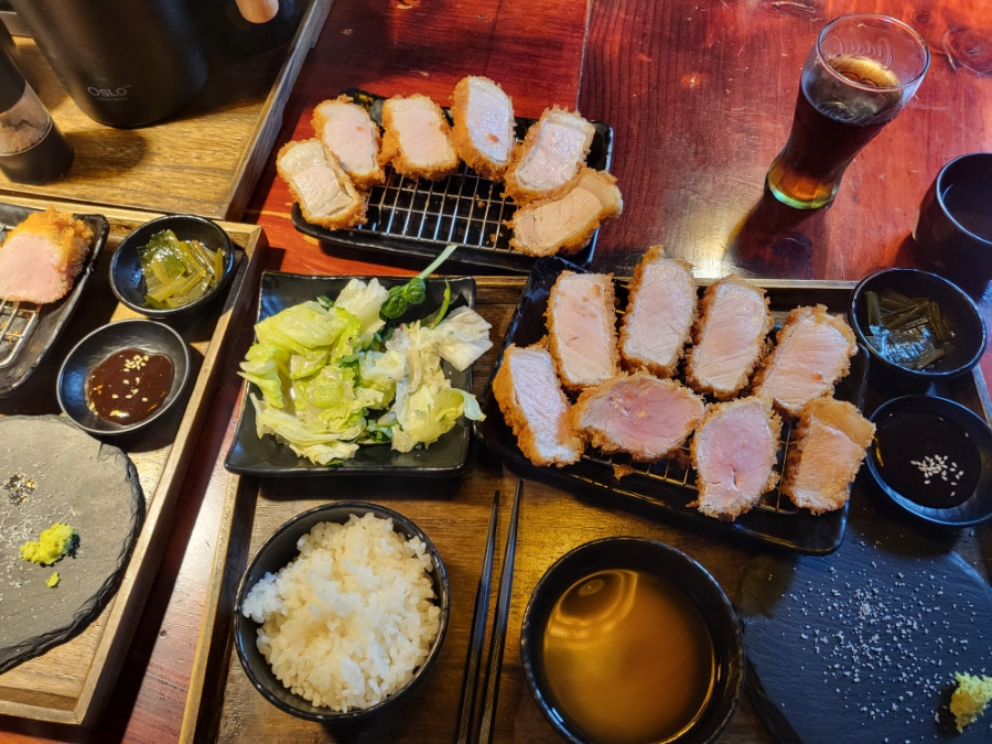 저와 남편은 이곳의 돈까스를 정말 좋아해서 메뉴 3개를 주문했습니다: 안심 1개, 등심 1개, 안심+등심 1개. 오픈 주방에서 주문 후 바로 만들어지는 돈까스는 바삭하고 맛있어요.